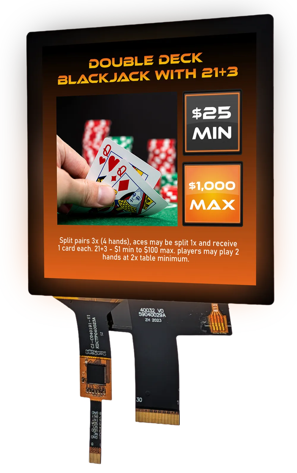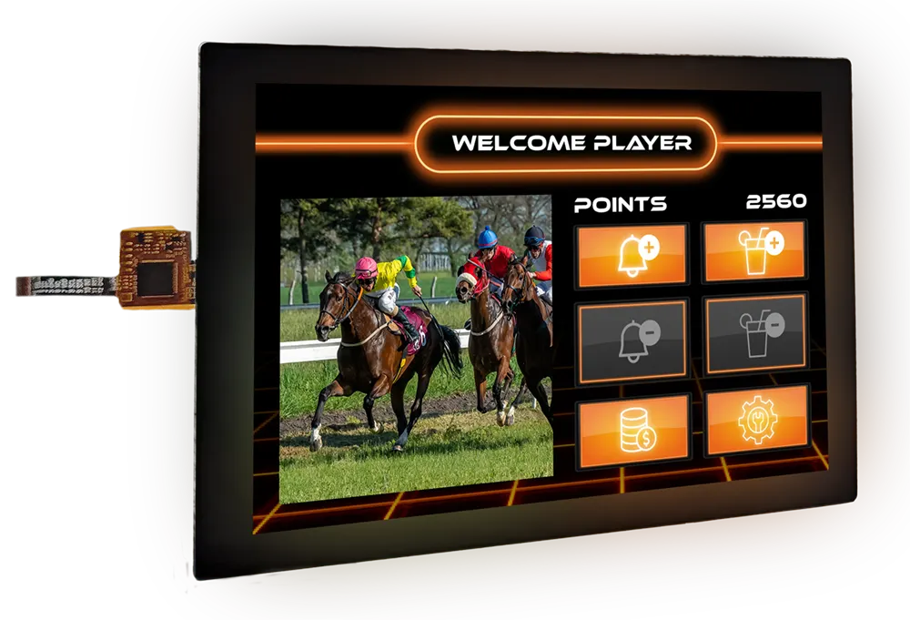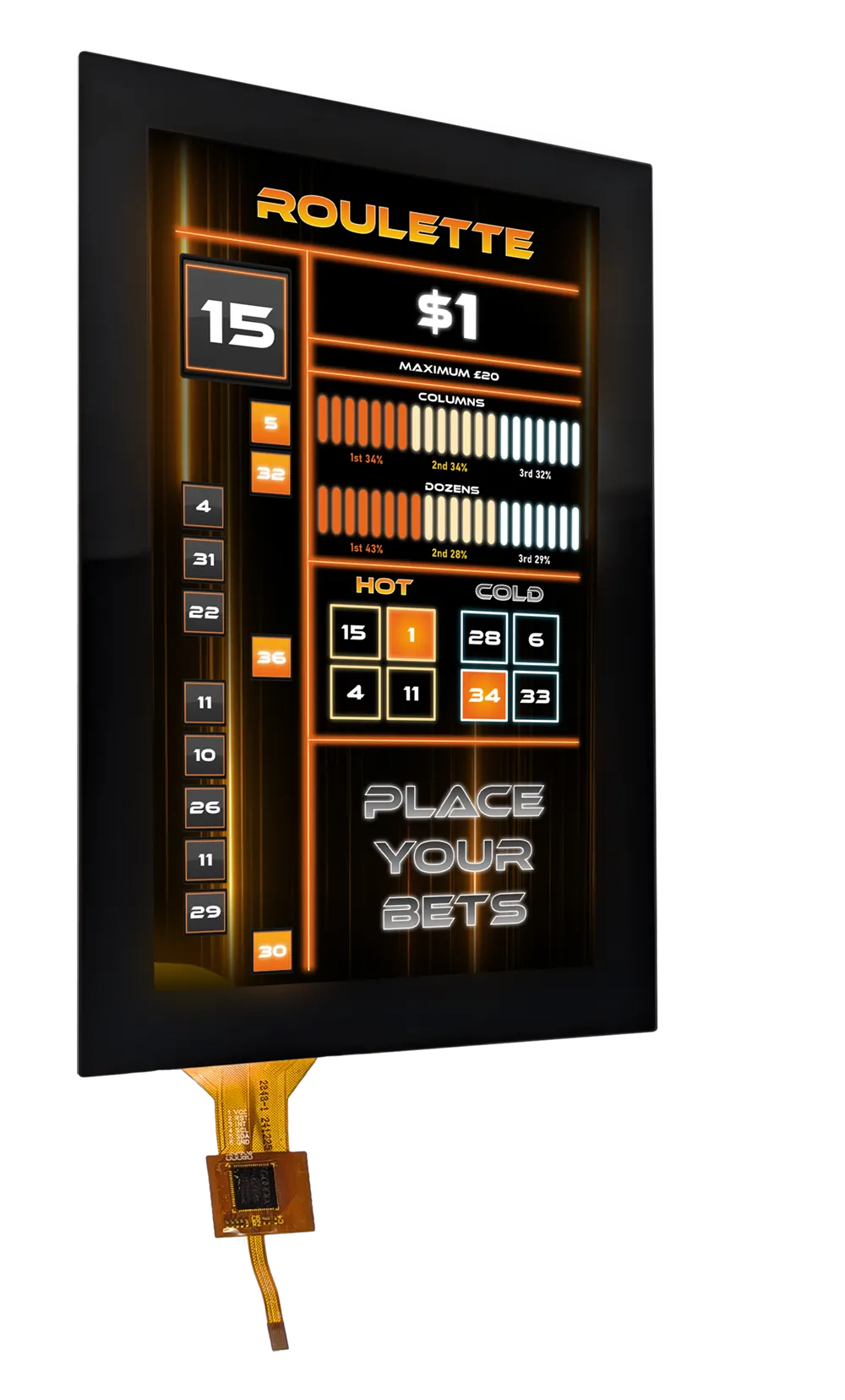 The examples below – from compact IPS panels to vibrant AMOLED and large high-resolution displays – are just a glimpse of what’s possible. Whether for player tracking, table games, sports betting, digital signage, or full cabinet builds, every display is custom-engineered to your exact requirements. Size, brightness, touch, durability, and long-term availability are all designed around your needs for seamless integration and reliable performance.
